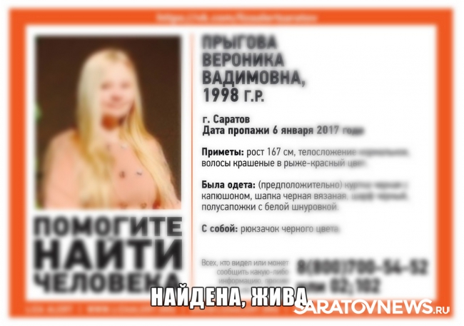 Напомним, ранее Saratovnews писал о розыске Вероники Вадимовны Прыговой. Девушку в черной куртке и с красными волосами с 6 января 2017 года искали в Саратове, Самаре, Тольятти и Жигулевске.