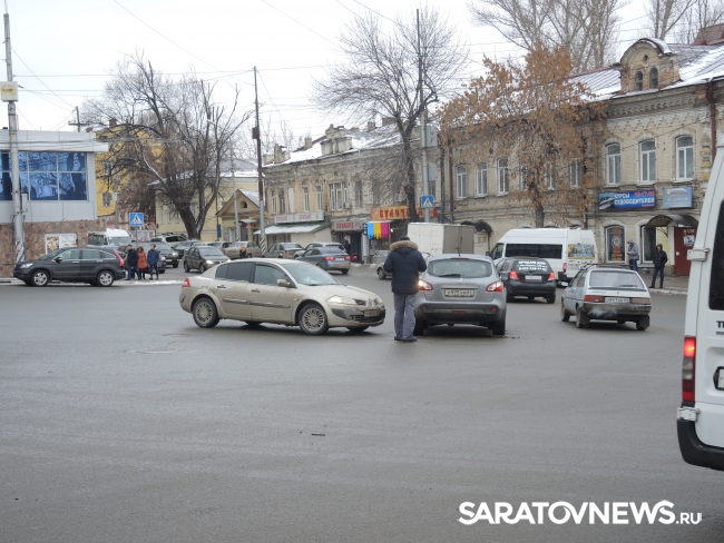 Сегодня днем в центре Саратова произошло двойное ДТП. Об этом ИА Saratovnews сообщил очевидец случившегося.