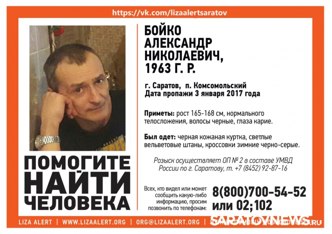 Розыск мужчины ведут активисты и сотрудники саратовского отдела полиции №2. Тех, кому известно о местонахождении Александра Бойко, просят звонить 02, 102 или 8(800)700-54-52.