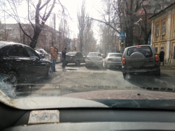 По словам очевидцев, две легковушки, одна из которых марки "Нексия", столкнулись на пересечении Рахова и Рабочей, в результате заняли собой всю дорогу.