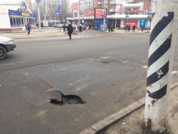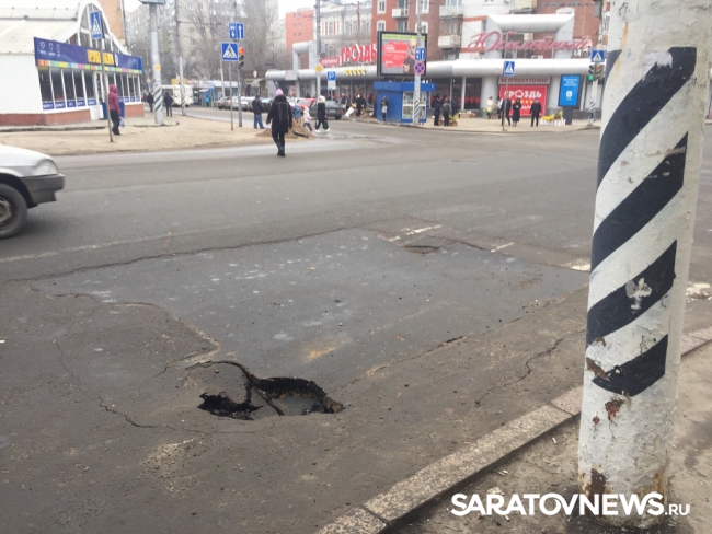 В Саратове возле автобусной остановки на пересечении улиц Московская и Чернышевского провалился асфальт. Фото образовавшейся на дороге ямы в редакцию Saratovnews прислали читатели.