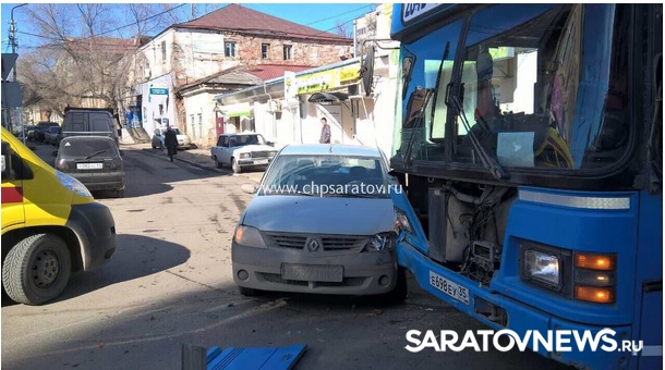 Сегодня днем в Саратове на улице Чернышевского произошла авария, в которой участвовали пассажирский автобус 284Б, следовавший из Энгельса в Саратов, и "Рено Логан".