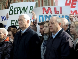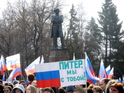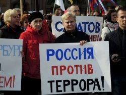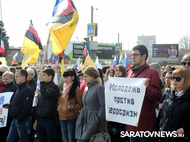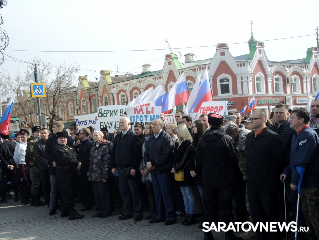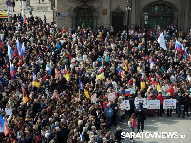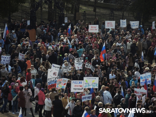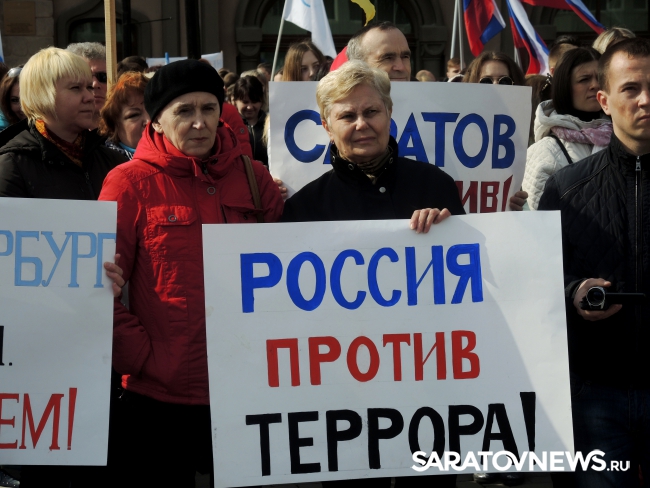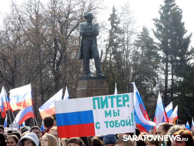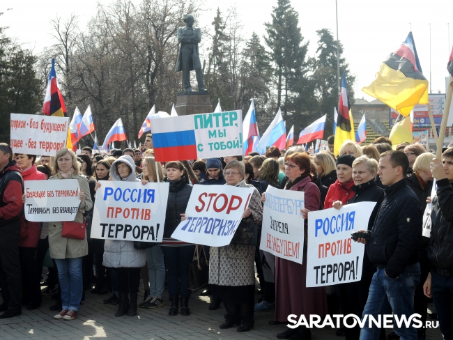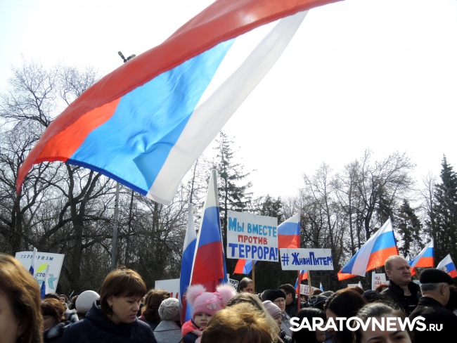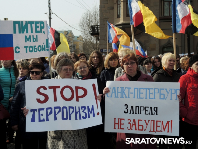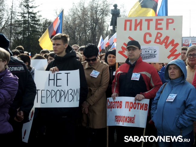 "Сегодня мы пришли сюда чтобы доказать что террористам нас не напугать. Мы не отсидимся в своих домах и не сделаем вид, что нам все равно. Сегодня со мной стоит мой младший сын. Я пришел сюда ради него. Я пришел показать, что я не боюсь террористов. Страшный теракт в Питере. Погибшие люди ни в чем не виноваты. Террористы хотят запугать наш народ, поставить на колени, заставить нас договариваться с ними. Этого не будет! Сегодня миллионы людей по всей стране вышли сказать "нет" черной чуме терроризма. Мы победим. Питер, мы с тобой", - выступил перед собравшимися депутат Саратовской городской думы Александр Янклович.