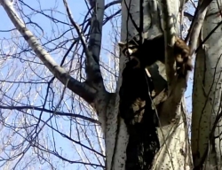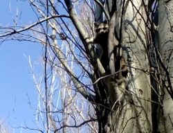 Предполагается, что енот сорвался с поводка у сотрудников зоопарка. После этого влез на тополь на высоту около 5 метров и не хотел слезать.