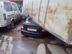 У большегруза отказали тормоза, и водитель попытался остановить автомобиль с помощью ручного тормоза. Это не удалось, и водитель решил остановиться, уйдя в право. Он вырулил на тротуар, убедившись, что там нет пешеходов и опрокинулся. В результате он подмял "Ладу Приору", припаркованную рядом. Водитель "Камаза" обошелся без значительных травм.