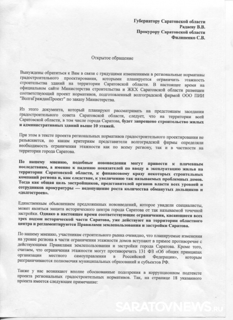 Речь в нем идет об ограничении высотного строительства на территории Саратовской области, которое планируется ввести, изменив нормативы градостроительного проектирования региона. По словам застройщиков, в настоящее время на официальном сайте министерства строительства и ЖКХ Саратовской области размещен соответствующий проект нормативов, который подготовила волгоградская фирма ООО ПИИ "ВолгаГражданПроект". Сообщается, что его собираются рассмотреть на предстоящем заседании градостроительного совета региона и в нем прописан запрет на строительство жилых и административных зданий выше десяти этажей.