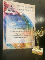 В этом году конкурс был проведен с декабря 2016г. по апрель 2017г. Торжественное награждение победителей состоялось 27 апреля 2017г. По итогам конкурса ЮБ "АргументЪ" признано победителем премии "Лидер года 2017" в номинации "Лучшая юридическая фирма".