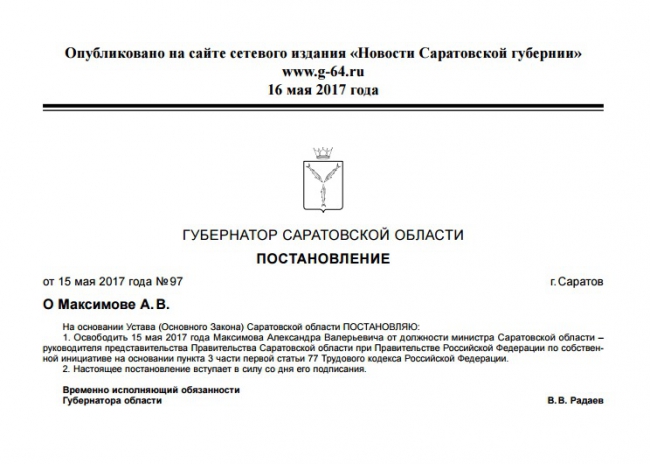 Временно исполняющий обязанности губернатора Саратовской области Валерий Радаев подписал постановление об освобождении Александра Максимова от должности министра — руководителя представительства правительства региона при правительстве РФ. Как говорится в документе, Александр Валерьевич покинул пост по собственной инициативе.