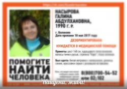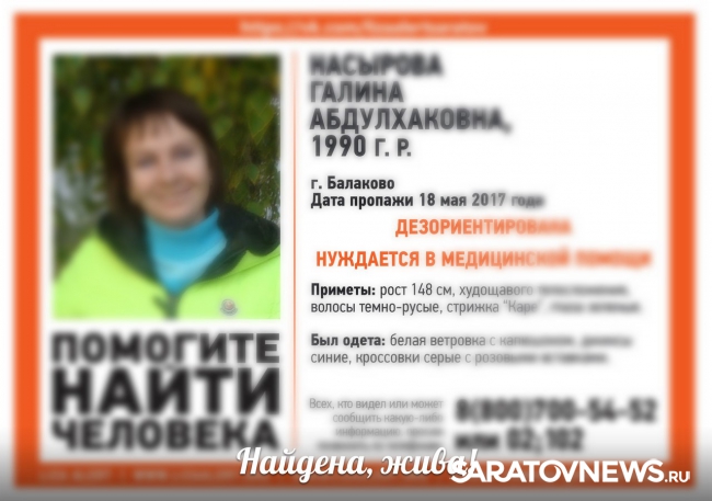 Напомним, как ранее писал Saratovnews, Галина Абдулхаковна Насырова ушла из дома 18 мая и перестала выходить на связь с близкими. Она была дезориентирована и нуждалась в помощи врачей. Худощавую женщину ростом в 148 см с темно-русыми волосами искали волонтеры и полиция. Пропавшая была одета в белую ветровку и джинсы.