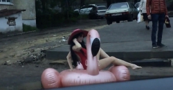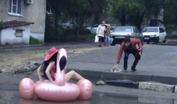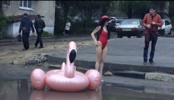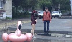 В акции участвовала девушка в красном купальнике, которая позировала перед камерой, сидя на надувном фламинго. Ее фотографировал молодой человек.