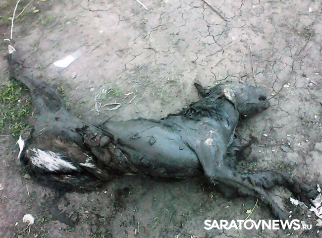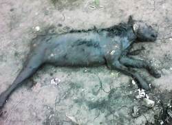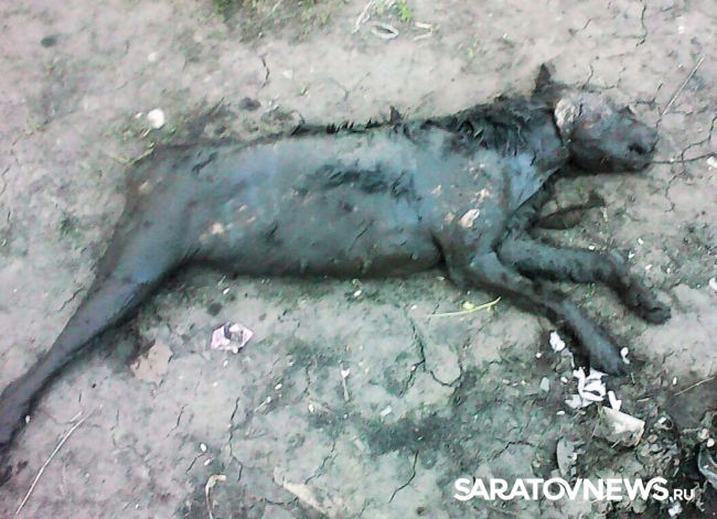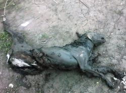 По словам очевидцев, неделю назад была найдена мертвая избитая собака, которую привязывали проволокой за горло и таскали на машине, а затем бросили.