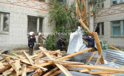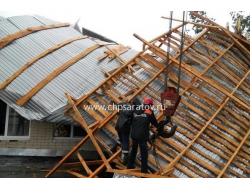 Шквалистый ветер сорвал часть крыши двухэтажного здания в селе Мечетное Советского района. Сегодня утром сотрудники Саратовской областной службы спасения разбирали опасно свисающую конструкцию - повреждено оказалось порядка 100 квадратных метров надстроенной крыши над помещением площадью в 750 квадратных метров.