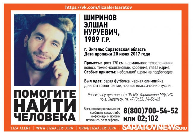 В Энгельсе Саратовской области пропал 28-летний Элшан Нуруевич Ширинов. Его разыскивают полицейские и волонтеры в группе "Лиза Алерт Саратов" в соцсети "Вконтакте".
