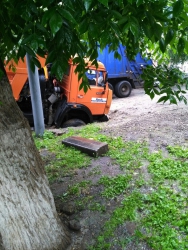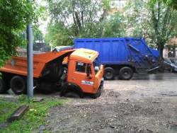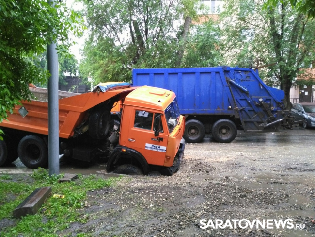 В Саратове на перекрестке улиц Зарубина и Симбирской грузовик "Камаз" провалился в дорожную яму. Как сообщили очевидцы в группе "Типичный Саратов" в соцсети "Вконтакте", провал на дороге засыпан песком, никаких опознавательных знаков о том, что рядом яма, на улице нет. В результате самосвал въехал в яму передним колесом.