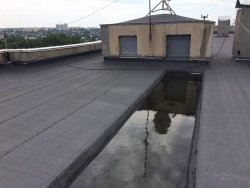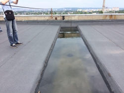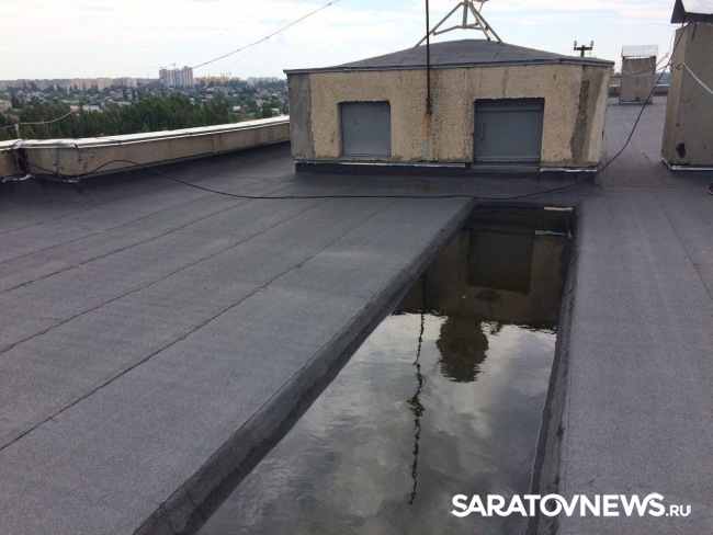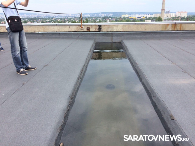 Пробравшись на крышу, ревизоры обнаружили там "бассейн" - с которого не уходит вода из-за забитой ливневки.