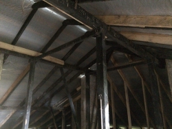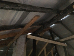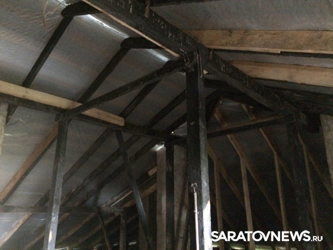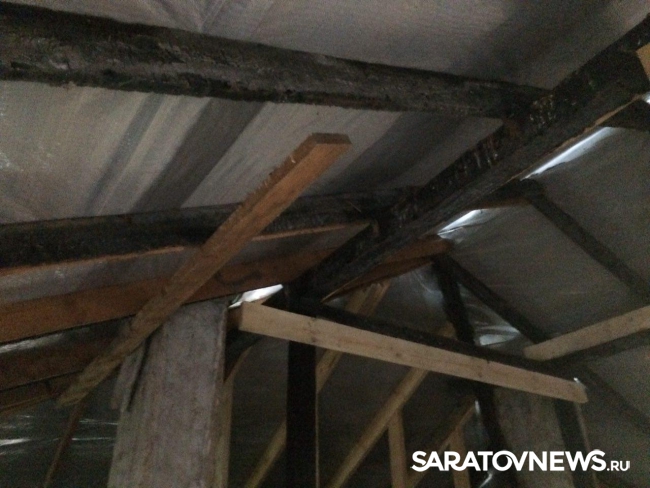 Как рассказали жильцы дома, ремонт проводился весной текущего года. Несмотря на то, что 20 лет назад дом горел, подрядчики заменили балки на крыше лишь частично, перемежая сгоревшие с новыми.