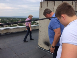 Второй локацией стал дом 27 по улице Транспортной. Чтобы проникнуть на крышу общественникам пришлось попросить вскрыть замок, поскольку у представителей УК и жильцов ключа не оказалось.