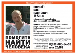 Как сообщают волонтеры поискового отряда "Лиза Алерт Саратов", пропаший - худощавый мужчина ростом 170 см, с русыми короткими волосами и зелеными глазами. У него его особая примета - татуировка "1973" на пальцах правой руки. Он был одет в темную майку с карманом на груди, голубые шорты до колен, темно-синюю бейсболку и черные сланцы. При себе у Олега Королева была черная барсетка на длинном ремне через плечо. Волонтеры начали инфо-поиск.