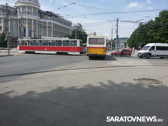 В центре Саратова произошла авария с участием трамвая. Как сообщают Saratovnews очевидцы, дорожный инцидент произошел на пересечении улиц Московская и Астраханская, напротив главного корпуса СГУ.