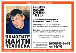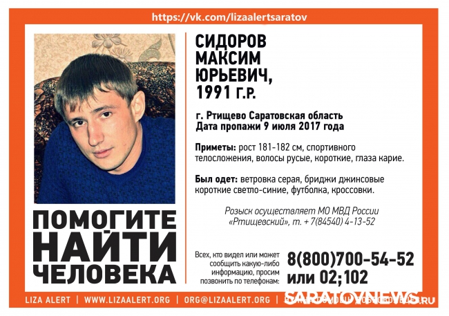 В Ртищево Саратовской области проал 26-летний Сидоров Максим Юрьевич. Об этом в социальных сетях сообщает "Поисковый отряд Лиза Алерт Саратов".