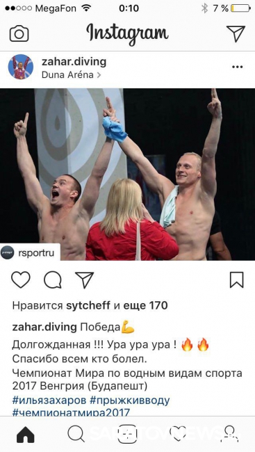 Саратовец Илья Захаров стал чемпионом мира по прыжкам в воду в Будапеште. Спортсмен из Саратова выступал в паре с Евгением Кузнецовым из Ставрополья в синхронных прыжках с трехметрового трамплина 15 июля.