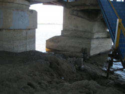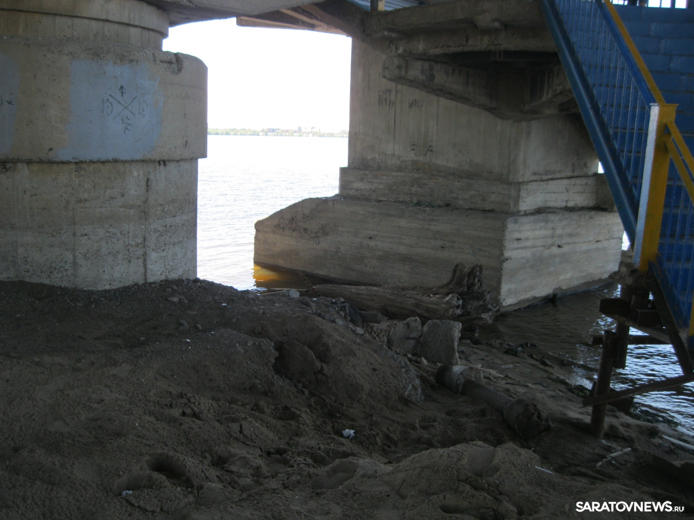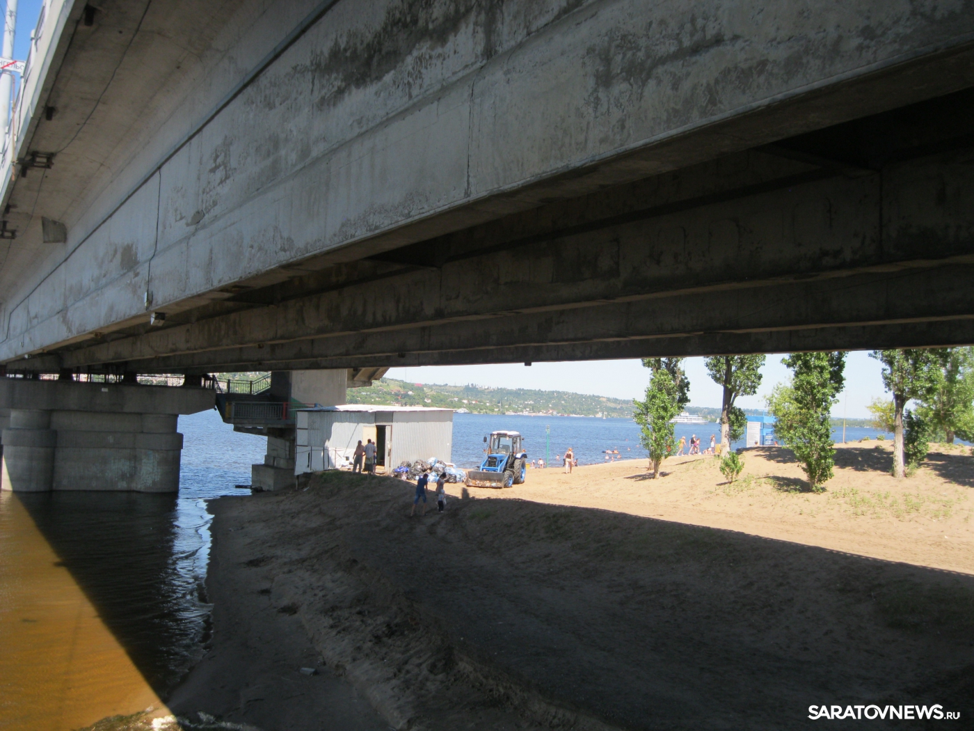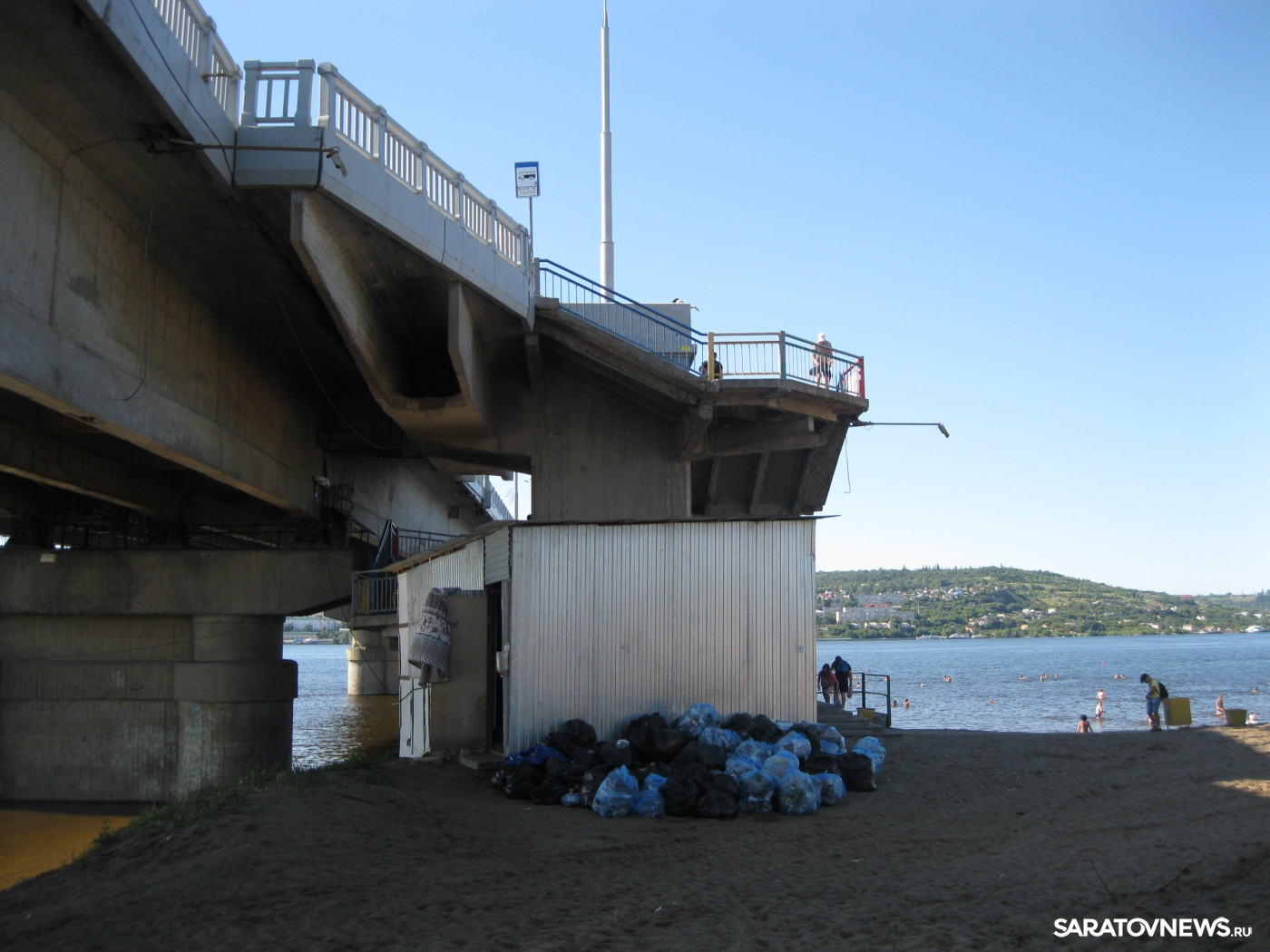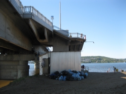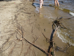 Прямо у схода с моста лежит груда мешков с мусором, повсюду разбросаны пустые бутылки, по всему берегу можно напороться на битое стекло, особенно много его под мостом. Высокая вода унесла множество деревьев, обнажив полузасохшие, очень острые корни и пеньки, ими усеяна вся прибрежная территория. Корневища не только мешают отдыхающим удобно расположиться на песке, на них постоянно натыкаешься и в воде, что делает купание небезопасным. Невозможно даже спокойно пройтись вдоль берега, не наткнувшись на какую-нибудь вросшую в песок корягу.