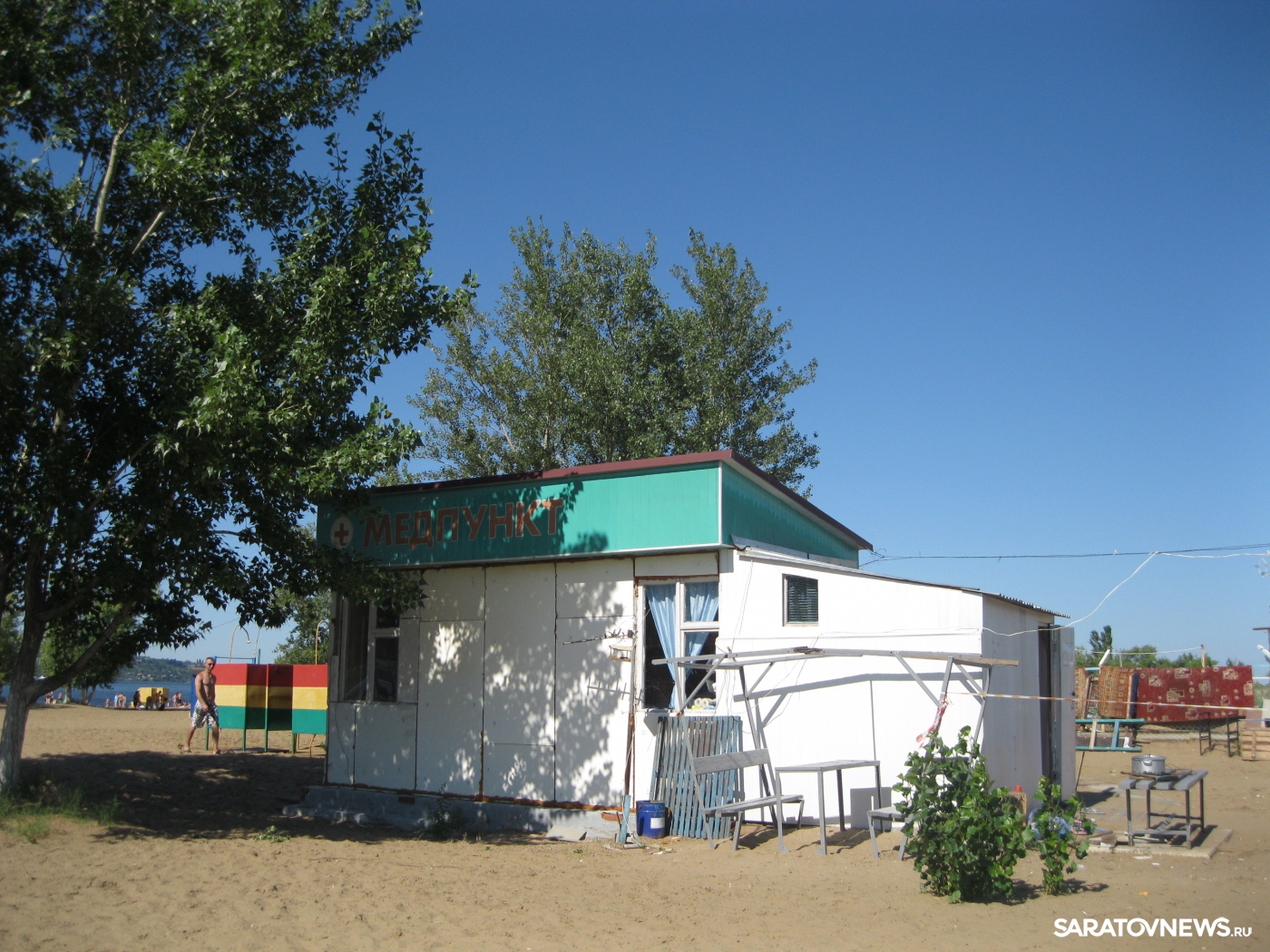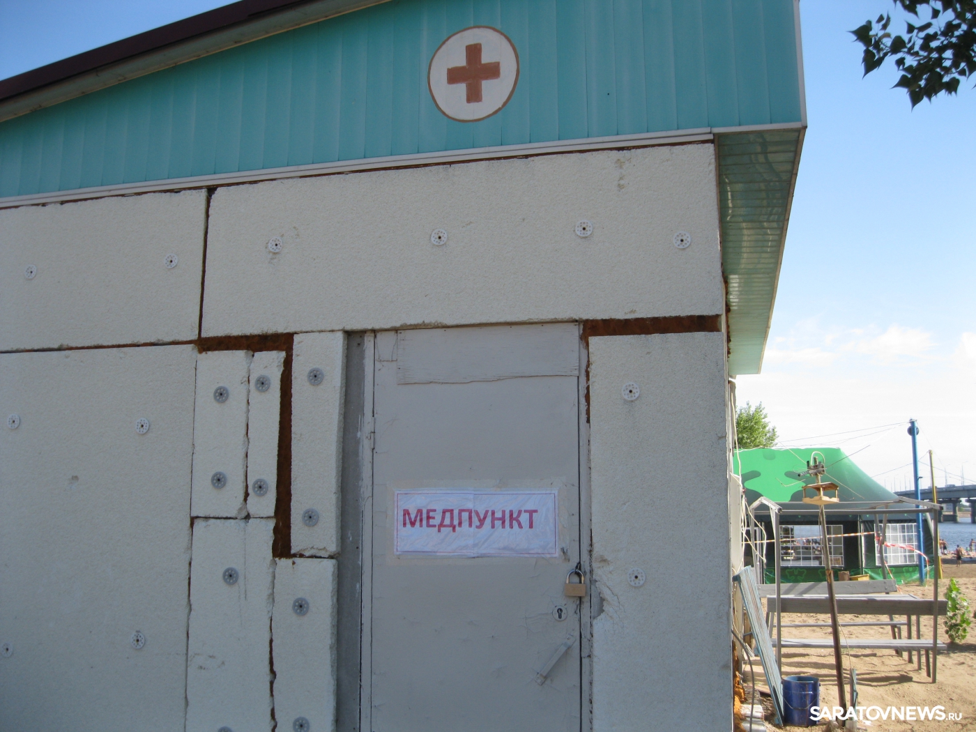 Не избежала этой участи и наш корреспондент, раскроив до крови палец на ноге. "За лейкопластырем пришлось отправиться в медпункт, в надежде, что уж это медсредство там обязательно найдется. Медпункт нашла, вернее некое ветхое строение, на котором имеется соответствующая надпись. Но на двери весит огромный замок! Так что правы оказались звонившие на сайт саратовцы. После настойчивого стука в единственное имевшееся окно другой половины строения, из него вышла разгневанная женщина. Как выяснилось, это была жена сторожа. Она эмоционально пояснила, что медпункт не работает и работать не будет: "И вообще, пляж еще никто не открывал, он тоже не работает, И нечего тут ходить и стучать". В общем, очень доходчиво всё объяснила. Не ясно только почему в полуторомиллионной агломерации (Саратов плюс Энгельс) не нашлось средств и возможностей для организации дежурства даже не врача, а хотя бы медсестры? Пляж – место скопления огромного количества людей под палящим солнцем, мало ли чего может случиться… И почему пляж не открыт в конце июля? Думали, лето не наступит никогда? Удивительная наивность! А если быть точнее – полное пренебрежение к организации летнего отдыха горожан! Саратовцы слышат только предвыборные обещания, в том числе и о строительстве нового пляжа. Но когда это будет и будет ли вообще? Навести порядок на "Городских песках" стоит гораздо дешевле, но городские власти, кажется, вообще забыли о существовании пляжа", - поделилась впечатлениями наш корреспондент.