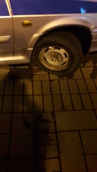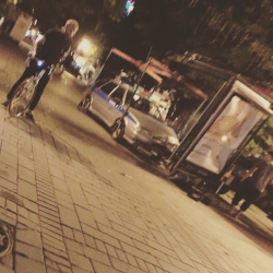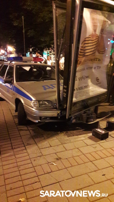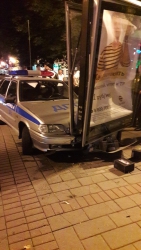 Пользователи опубликовали фотографии, на которых видно, как патрульный автомобиль въехал в рекламный щит в центре пешеходной улицы. У автомобиля оказался повреждена передняя часть, разбита фара и помят капот.