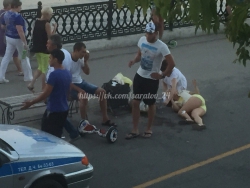 Около 20:20 на набережной случилась необычная авария. При этом версии очевидцев и полиции относительно нее разошлись. Так, один из пользователей соцсети сообщил, что девушка на электроскутере не справилась с управлением и задела парня на гироскутере. Электромопед упал, а водитель и пассажир получили травмы. Другой очевидец говорит, что женщина ехала на гироскутере, а мужчина управлял электромопедом. Транспортные средства столкнулись, и девушка упала и получила травмы. После чего подъехали сотрудники ДПС и "скорая".