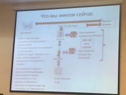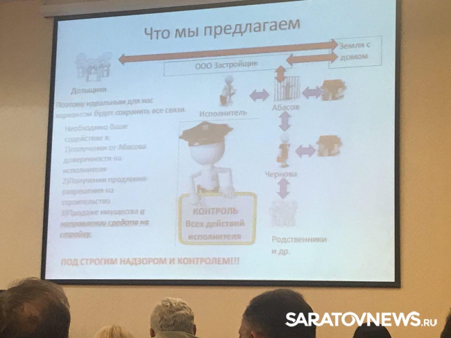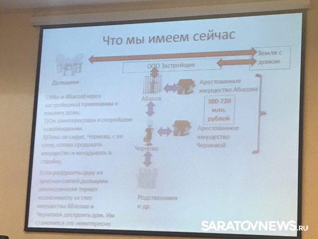 Представитель инициативной группы ЖК "Астраханский" Дмитрий Любимов показал чиновникам презентацию с планом по достройке дома за счёт имущества арестованного недавно Абасова, который обладает активами на сумму от 350 до 720 миллионов рублей. "Минстрой предлагает нам создание ЖСК, но тогда мы потеряем связь с Абасовым. Он будет решать свои вопросы и забудет о проблемах дольщиков. Нам неизвестно, как мы получим деньги", - заявил он, добавив, что имущество арестовано в рамках следствия, а также находится в залоге в одном из банков. "Банк обратился за взысканием долга в свою пользу. Мы боимся, что банк опередит нас и лишит нас этого имущества", -пояснил дольщик.