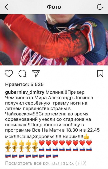 "Молния!!! Призер Чемпионата Мира Александр Логинов получил серьёзную травму ноги на летнем первенстве страны в Чайковском!!!! Спортсмена во время соревнований унесли со стадиона на носилках!!! Саша, здоровья!!! Верим!!!" - написал комментатор под опубликованной им фотографией саратовского спортсмена.