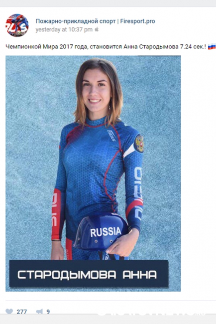 В первый соревновательный день Анна Стародымова уже в предварительных забегах была самой быстрой при подъеме по штурмовой лестнице, ее результат — 7.25 секунды. В финальном забеге она улучшила свое время на одну секунду и заняла первое место.