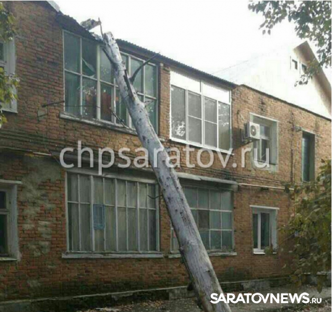 Портал "ЧП-Саратов" опубликовал фотографии с места происшествия. На фото видно, что ствол дерева погнул кровлю дома. В результате падения дерева никто не пострадал.