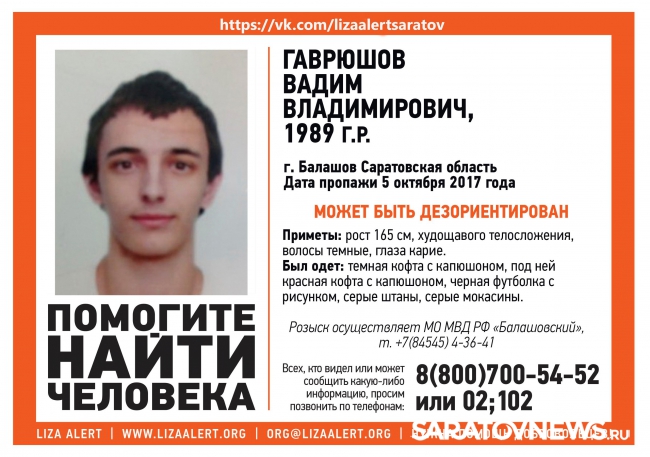 Как сообщили активисты в группе "Лиза Алерт Саратов" в соцсети "Вконтакте", 28-летний мужчина ушел из дома 5 октября 2017 года и не вернулся.