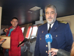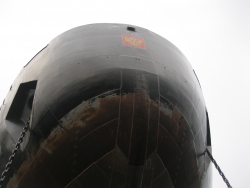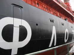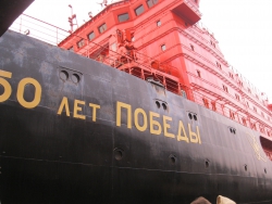 А потом мы поднялись на палубу ледокола "50 лет Победы", где зашли на центральный пункт управления, побывали на ходовом мостике, в кают-компании и машинном отделении атомного гиганта. Надо сказать, с высоты 50 метров открывается очень живописный вид на Кольский залив и морской порт. Экскурсию для нас провел капитан ледокола Дмитрий Лобусов. Он рассказал, как помимо проводки караванов судов по СМП, на суде осуществляются туристические круизы на Северный полюс. Дмитрий Викторович подчеркнул, что за все время эксплуатации атомного реактора, не было ни одной аварийной ситуации, что говорит о большой надежности и безопасности ЯЭУ. А о том, что ледовая обстановка на Севморпути бывает весьма сложной, красноречиво свидетельствовала двухметровая вмятина в правом боку судна. "Да это мы с айсбергом не очень удачно встретились. Обычное дело. Но у нас такая крепкая броня, что ничего не страшно", - спокойно пояснил капитан.