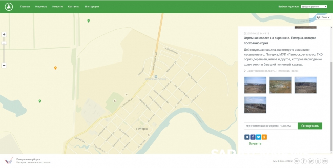 Необходимо отметить, что Министерством природных ресурсов и экологии Саратовской области рассчитан средний норматив производства ТКО. В городах и рабочих поселках с численностью более жителей более 5000 человек он равен 0,18 кубометров на человека в месяц и подтверждается фактическим мусорообразованием. По результатам анализа можно сделать вывод, что в большинстве муниципальных районов, обслуживаемых новой коммунальной инфраструктурой по обращению с ТКО, больше половины коммунальных отходов населения не доезжают до муниципальных мусороперегрузочных станций и не попадают на обработку и экологически безопасное захоронение на Энгельсском мусороперерабатывающем комплексе. Можно предположить, что часть коммунальных отходов утилизируется жителями частного сектора самостоятельно. Однако основная масса этих отходов оказывается на несанкционированных свалках. Так, накануне в Питерском районе активисты общероссийского народного фронта провели рейд на основании информации, которая была размещена на интерактивной карте свалок проекта ОНФ "Генеральная уборка". По сообщениям активистов, крупную нелегальную свалку в овраге в окрестностях р.п. Питерка организовало местное муниципальное предприятие, куда на протяжении трех месяцев свозило все коммунальные отходы. В Советском районе, который занял второе место в нашем рейтинге, активисты нашли 59 незаконных свалок и занесли соответствующую информацию на интерактивную карту.