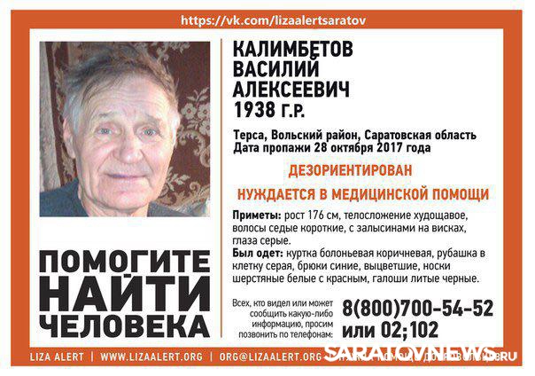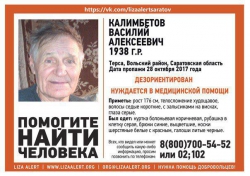 В селе Терса Вольского района волонтеры и полиция ведут поиски пропавшего без вести 79-летнего Василия Калимбетова. Об этом сообщает группа поискового отряда "Лиза Алерт". Сообщается, что мужчина дезорентирован и нуждается в медицинской помощи. В последний раз родственники видели его в минувшую субботу, 28 октября.