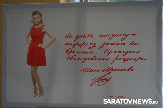 Необычная акция, приуроченная ко Дню борьбы с инсультом, прошла в Саратове. 30 октября в рамках акции в нашем городе открылась фотовыставка под названием "Оденься в красное". Ее цель – привлечь внимание общественности к опасности сердечно-сосудистых заболеваний, напомнить гражданам о профилактике и факторах риска сосудистых болезней. Центральным элементом фотовыставки стало красное платье, символизирующее тревогу в связи со стремительным ростом распространенности сердечно-сосудистых заболеваний во всем мире. А главными героинями - Ирина Слуцкая, Зара, Жасмин, Инна Маликова, Дарья Повереннова, Ирена Понарошку, Яна Чурикова, Юлия Началова и многие другие российские звезды. Всего двенадцать успешных женщин: спортсменки, музыканты, телеведущие и актрисы, которые обратились к россиянам с личным призывом задуматься о состоянии здоровья своего
