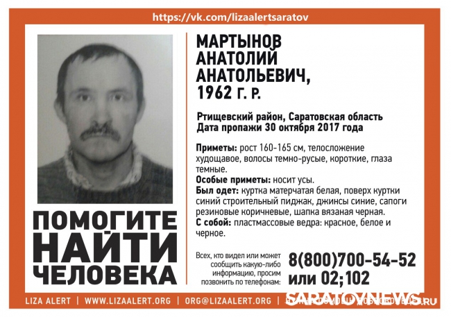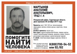 В Саратовской области волонтеры и полиция ведут поиски пропавшего 55-летнего Анатолия Мартынова. Соответствующая информация появилась в группе поискового отряда "Лиза Алерт". Сообщается, что мужчина пропал в Ртищевском районе 30 октября.