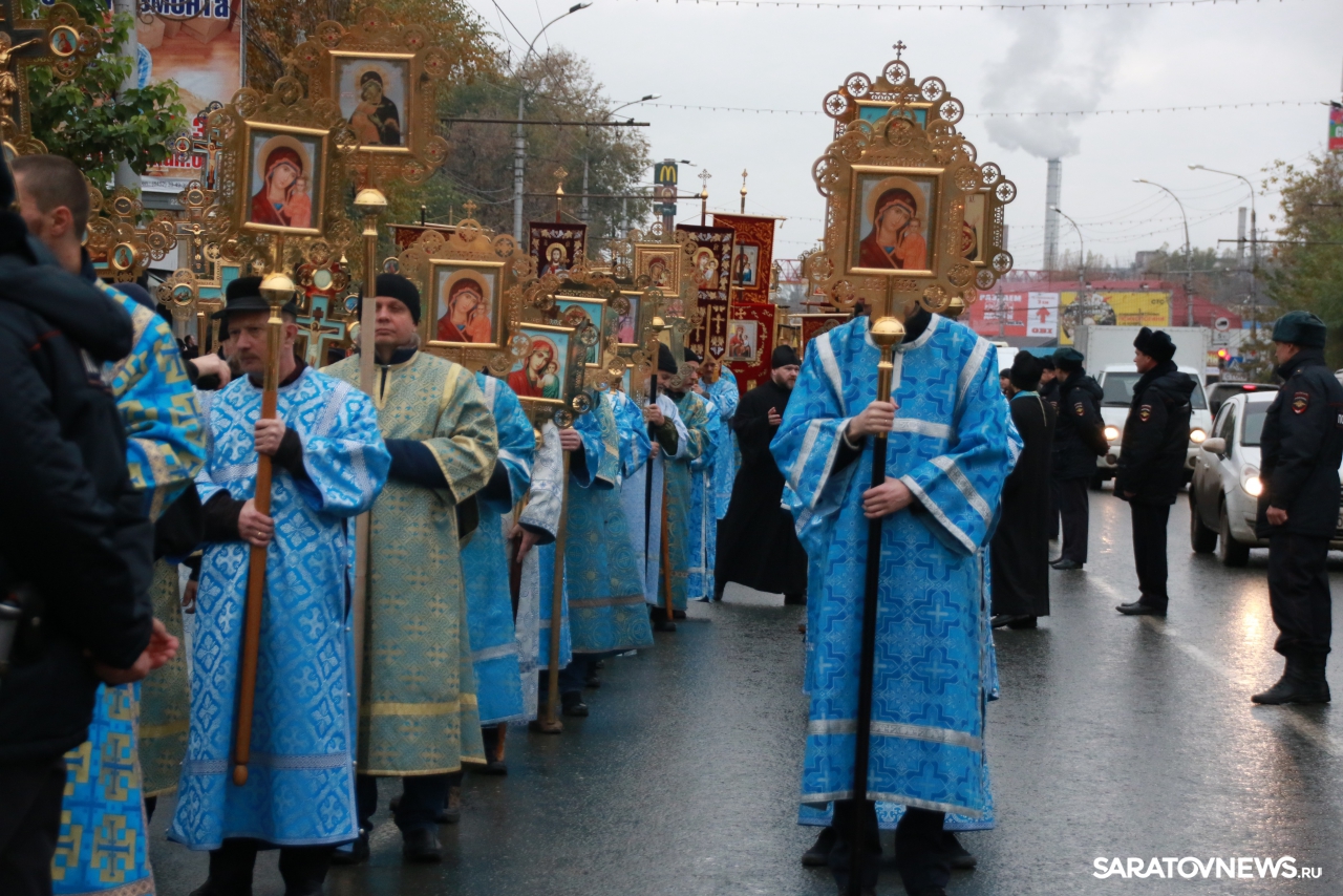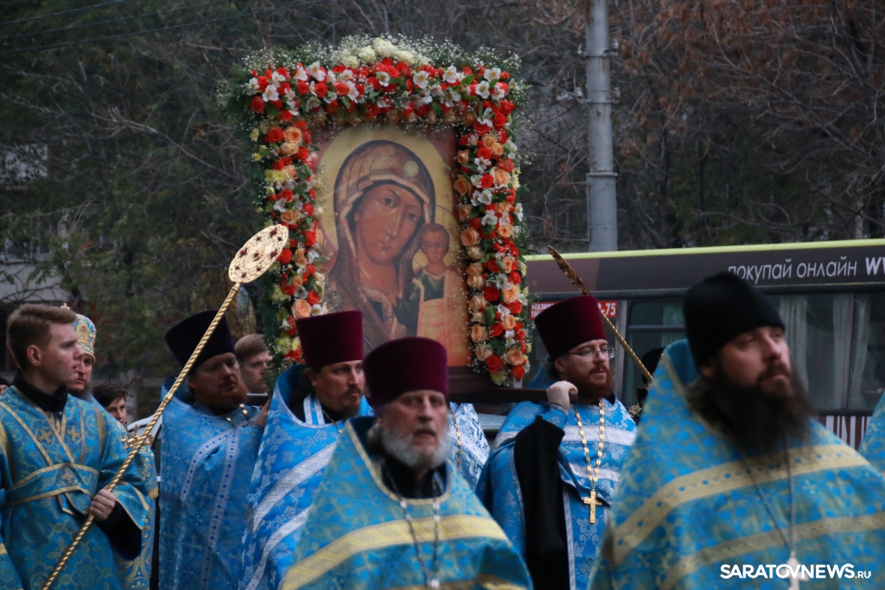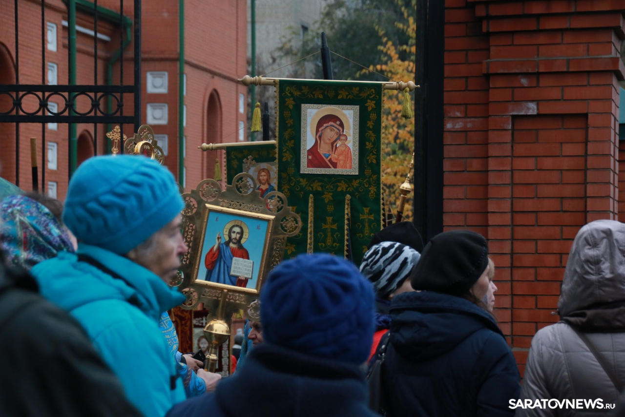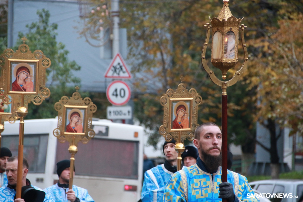 Ее провели Митрополит Саратовский и Вольский Лонгин и Епископ Покровский и Николаевский Пахомий. После окончания службы колонна священников и горожан направилась к Свято-Троицкому кафедральному собору. Для свободного движения процессии полицейские полностью перекрыли полосу движения по Чернышевского в сторону улицы Московской. Горожане снимали происходящее на телефоны, а также присоединялись к шествию. Завершилось мероприятие праздничным молебеном Божией Матери около Троицкого собора. Там хранится старинный список с чудотворного Казанского образа Пресвятой Богородицы XVII века.