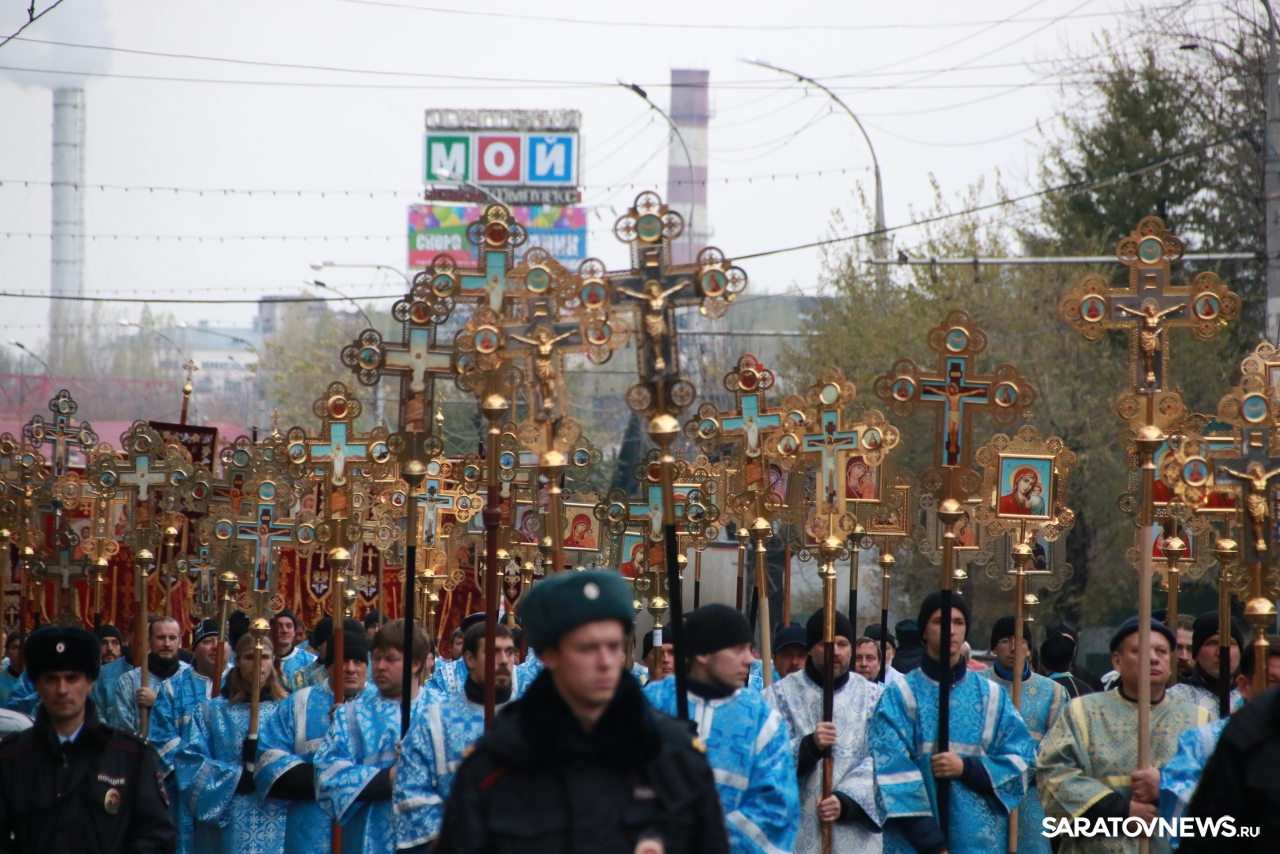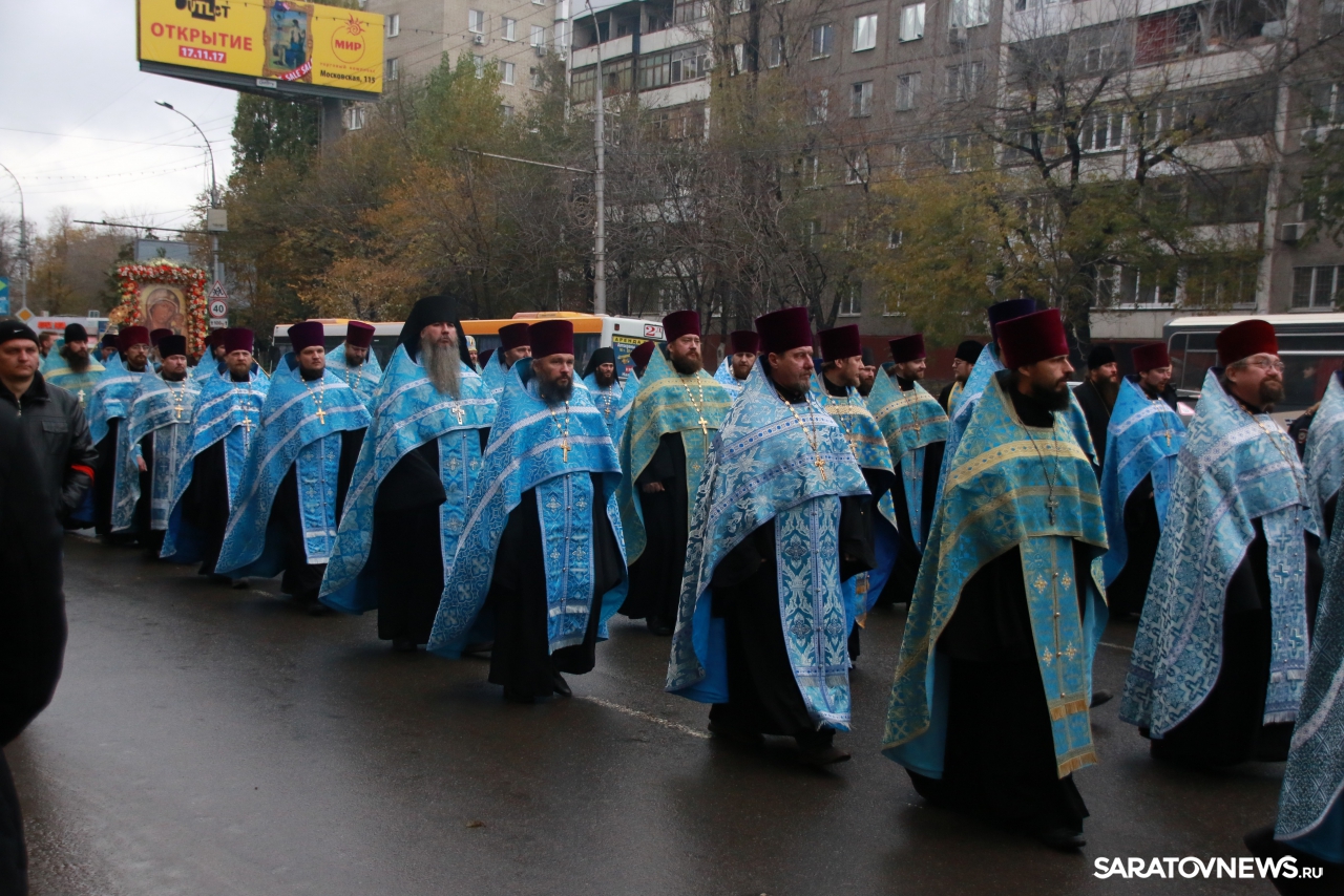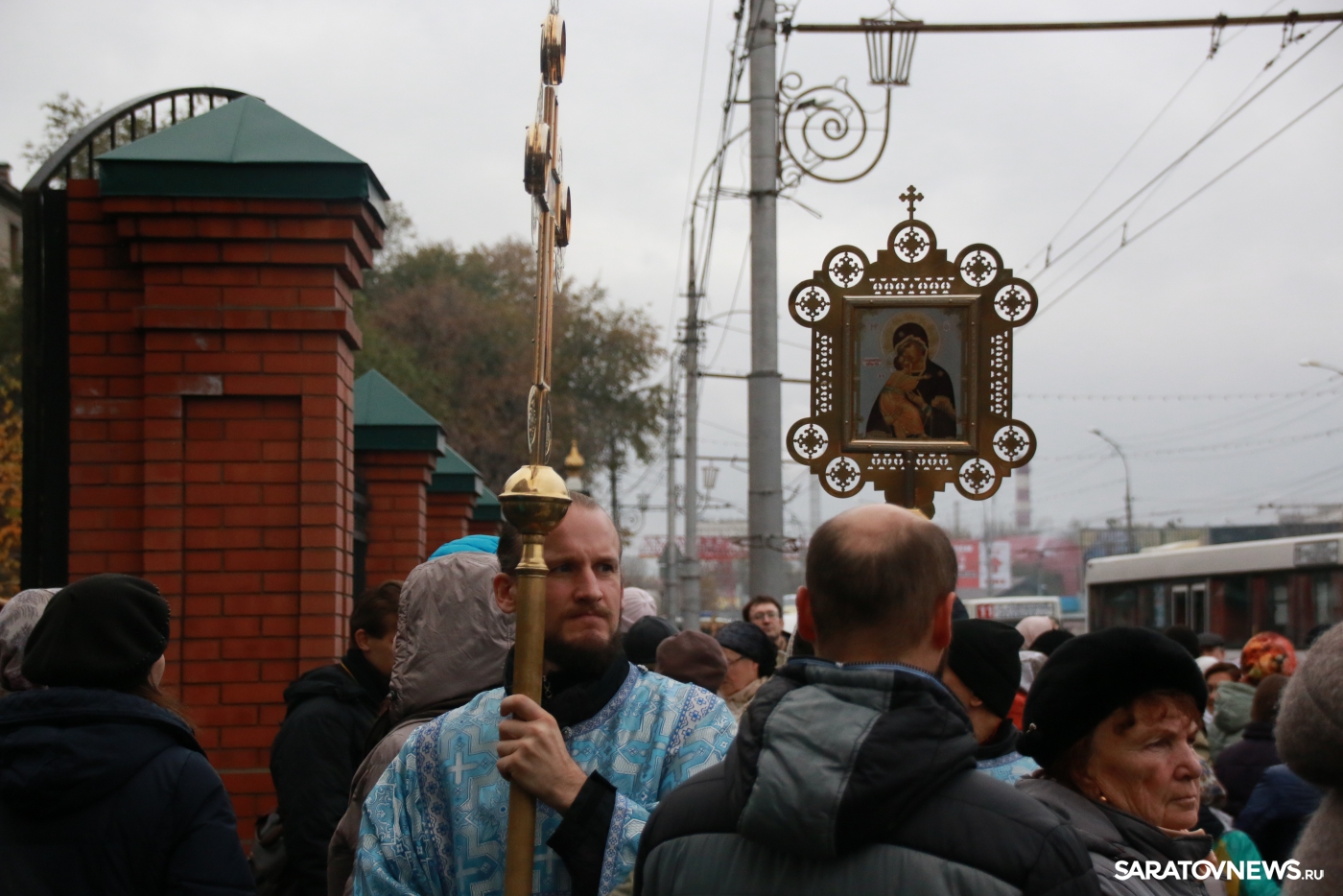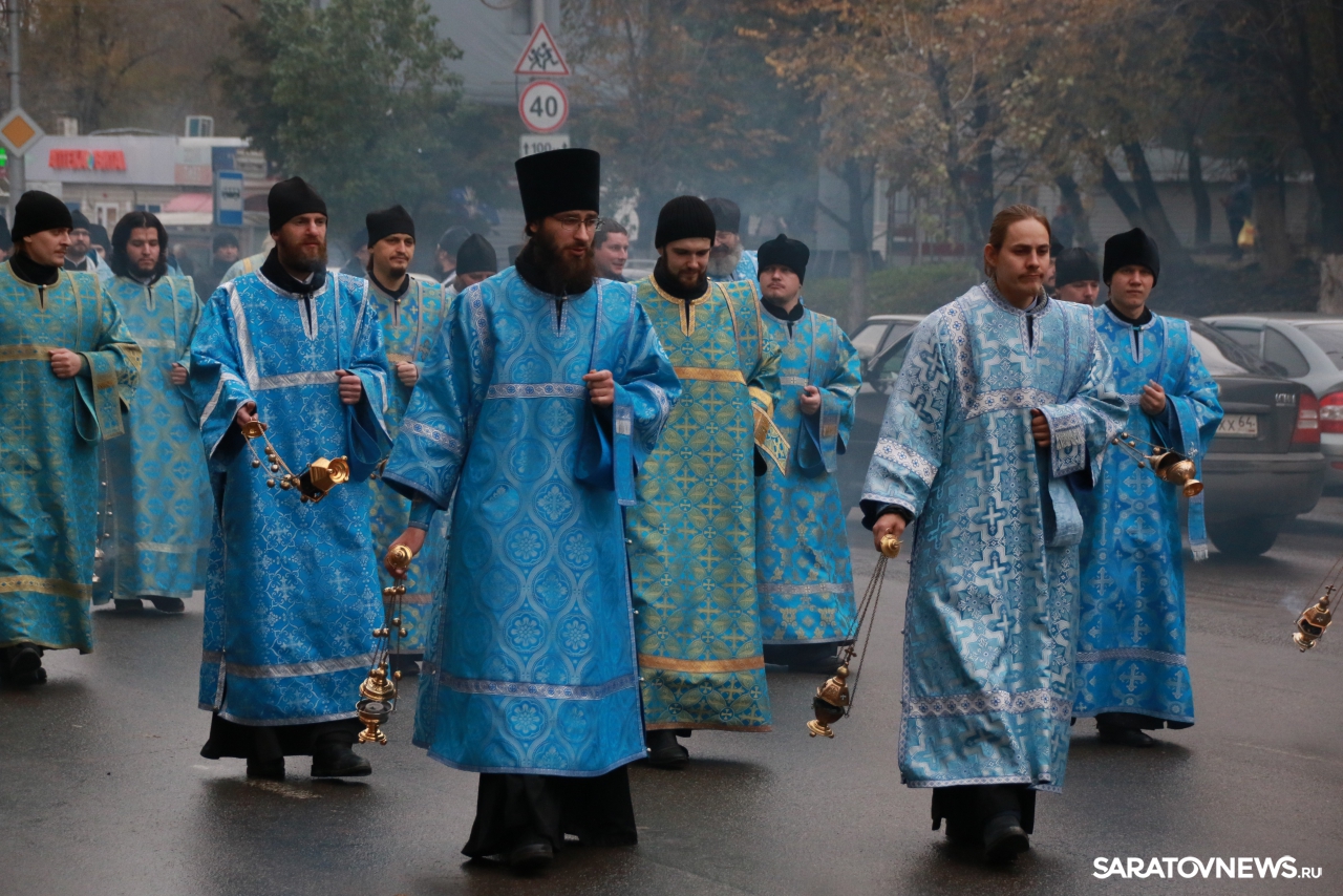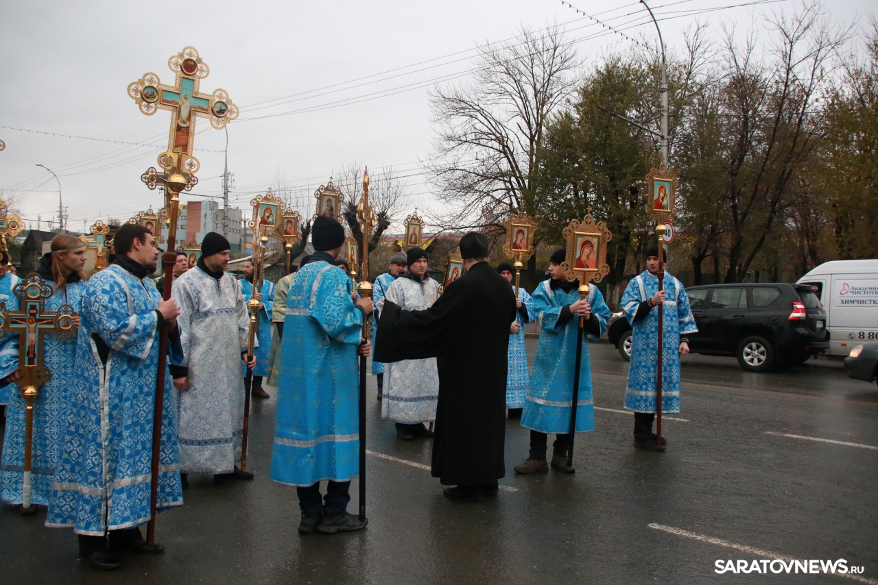 Ее провели Митрополит Саратовский и Вольский Лонгин и Епископ Покровский и Николаевский Пахомий. После окончания службы колонна священников и горожан направилась к Свято-Троицкому кафедральному собору. Для свободного движения процессии полицейские полностью перекрыли полосу движения по Чернышевского в сторону улицы Московской. Горожане снимали происходящее на телефоны, а также присоединялись к шествию. Завершилось мероприятие праздничным молебеном Божией Матери около Троицкого собора. Там хранится старинный список с чудотворного Казанского образа Пресвятой Богородицы XVII века.