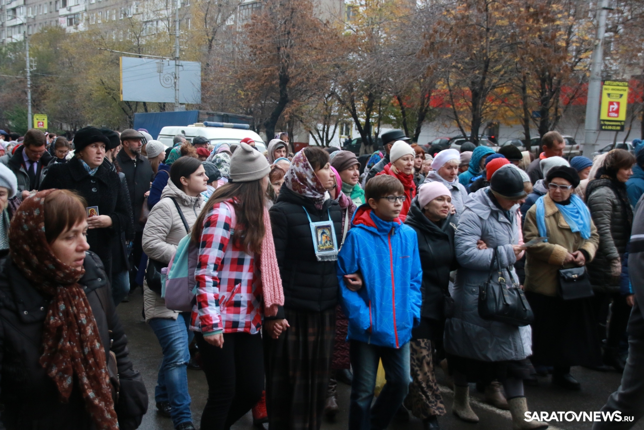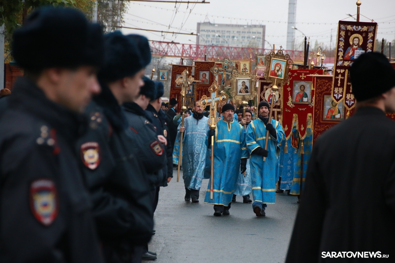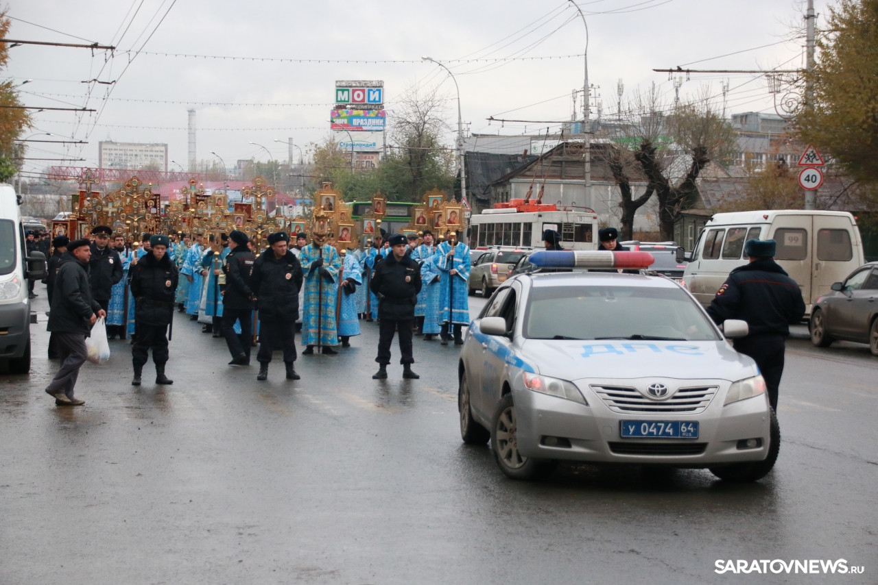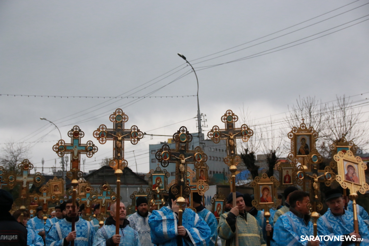 Ее провели Митрополит Саратовский и Вольский Лонгин и Епископ Покровский и Николаевский Пахомий. После окончания службы колонна священников и горожан направилась к Свято-Троицкому кафедральному собору. Для свободного движения процессии полицейские полностью перекрыли полосу движения по Чернышевского в сторону улицы Московской. Горожане снимали происходящее на телефоны, а также присоединялись к шествию. Завершилось мероприятие праздничным молебеном Божией Матери около Троицкого собора. Там хранится старинный список с чудотворного Казанского образа Пресвятой Богородицы XVII века.