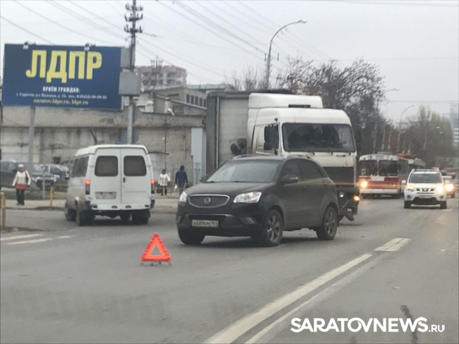 На пересечении Новоузенской и Чернышевского столкнулись тягач "МАЗ" с прицепом и "Санг Йонг". Предположительно, в результате аварии никто не пострадал. Водители транспортных средств ожидают сотрудников ГИБДД.