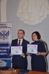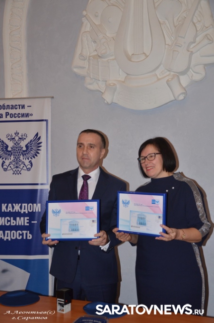 Торжественное гашение новых конвертов провели директор филармонии Анэта Николаева и директор Саратовского филиала "Почты России" Булат Ахметзянов.