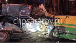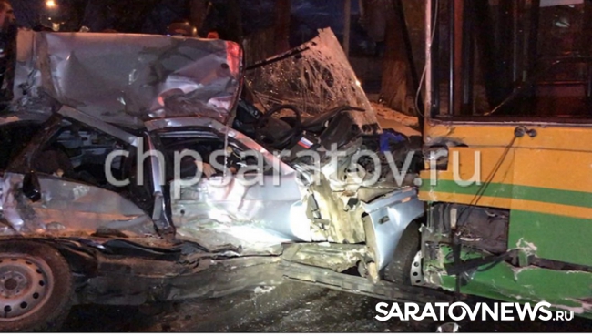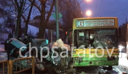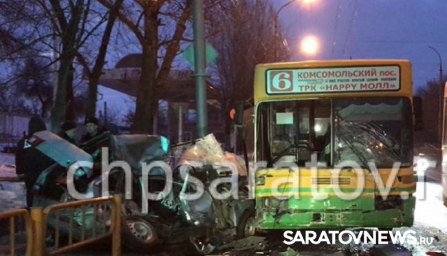 По данным "ЧП-Саратов", водитель "двенадцатой" потерял управление, протаранил ограждение и вылетел на встречную, где произошло столкновение с автобусом, который следовал в сторону Ленинского района. В городской Госавтоинспекции уточнили, что автобус в момент столкновения стоял, так как для него горел красный свет светофора.
