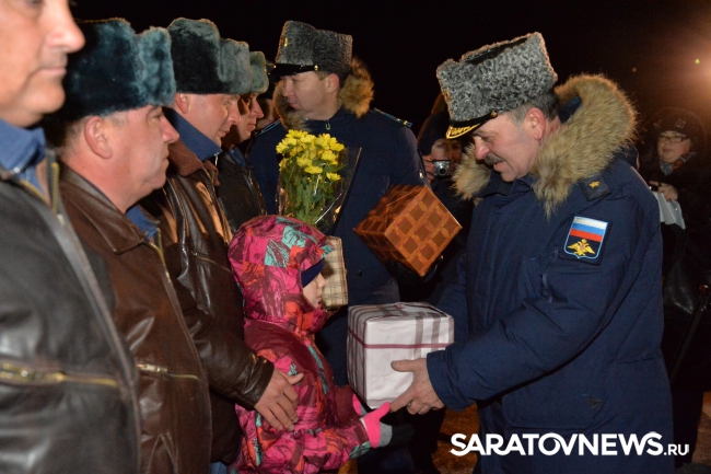 Шестерых военных, которые участвовали в боях в Сирии, встречали на военном аэродроме Багай-Барановка в Вольском районе. Экипаж вернувшегося из Сирии военно-транспортного самолета Ан-72 приветствовали губернатор региона Валерий Радаев и начальник государственного летно-испытательного центра Минобороны России имени Чкалова, генерал-майор, Герой России Радик Бариев.