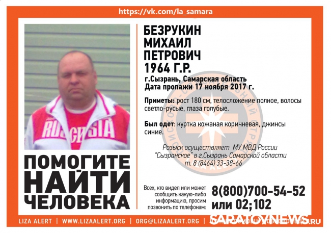 По данным участников поисковой группы, Михаил Петрович Безрукин пропал в Сызрани Самарской области. Он вышел из дома 17 ноября 2017 года и не вернулся, после чего родные потеряли с ним связь.