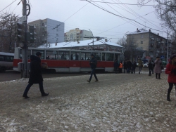 Пассажиры трамвая попытались толкнуть вагон, но у них ничего не вышло. Движение трамваев в этом районе затруднено.