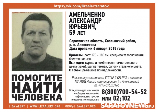 Мужчину также ищут сотрудники пункта полиции №2 при отделе полиции №3 по Балаковскому району (в поселке Алексеевка). Телефон +7 (845 95) 2-31-66.