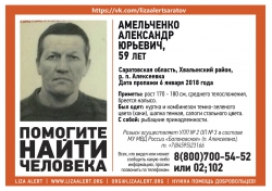 Как сообщают волонтеры группы "Лиза Алерт Саратов" в социальной сети "Вконтакте", мужчина из поселка Алексеевка пропал вчера, 6 января. Бритый налысо мужчина ростом 170-180 см, среднего телосложения, был одет в куртку и комбинезон темно-зеленого цвета (хаки), темную шапку и сапоги стального цвета. С собой у него были рыбацкие принадлежности.